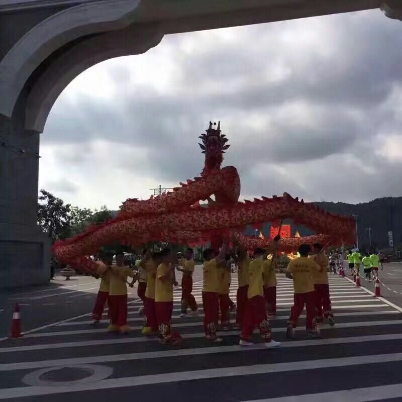 舞龍(dragon dance)的“龍”,通常都安頓在當(dāng)?shù)氐凝埻鯊R中,舞龍之日,以旌旗、鑼鼓、號(hào)角為前導(dǎo),將龍身從廟中請(qǐng)出來(lái),接上龍頭龍尾,舉行點(diǎn)睛典禮。龍身用竹扎成圓龍狀,節(jié)節(jié)相連,外面覆罩畫(huà)有龍鱗的巨幅紅布,每隔5、6尺有一人掌竿,首尾相距約莫有十?dāng)?shù)來(lái)丈長(zhǎng)。龍前由一人持竿領(lǐng)前,竿頂豎一巨球,作為引導(dǎo)。舞時(shí),巨球前后左右四周搖擺,龍首作搶球狀,引起龍身游走飛動(dòng)。